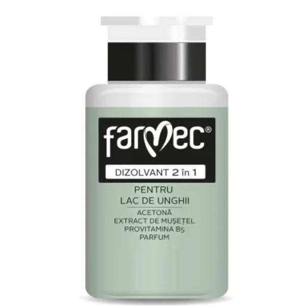 Dizolvant 2 in 1 pentru Lac de Unghii - Farmec, 150 ml: produs 2 in 1 ce dizolva si elimina rapid si eficient lacul de unghii, iar in acelasi timp protejeaza unghia, avand o formula blanda, usor parfumata, imbogatita cu extract de musetel cu efect relaxant si antiiritant, precum si cu provitamina B5 pentru intarirea si hidratarea unghiilor. Contine acetona.