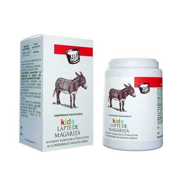 Lapte de Magarita Kids Plasmon, 10 comprimate masticabile: comprimate masticabile cu aroma de portocale, pentru copiii cu varsta de peste 3 ani, cu o formula pe baza de lapte de magarita liofilizat. Acesta este bogat in substante benefice organismului (vitamine, minerale, acizi grasi Omega-3 si 6, probiotice si enzima lizozim), care sustin sistemul imunitar al copiilor si ajuta la mentinerea sanatatii sistemului respirator.