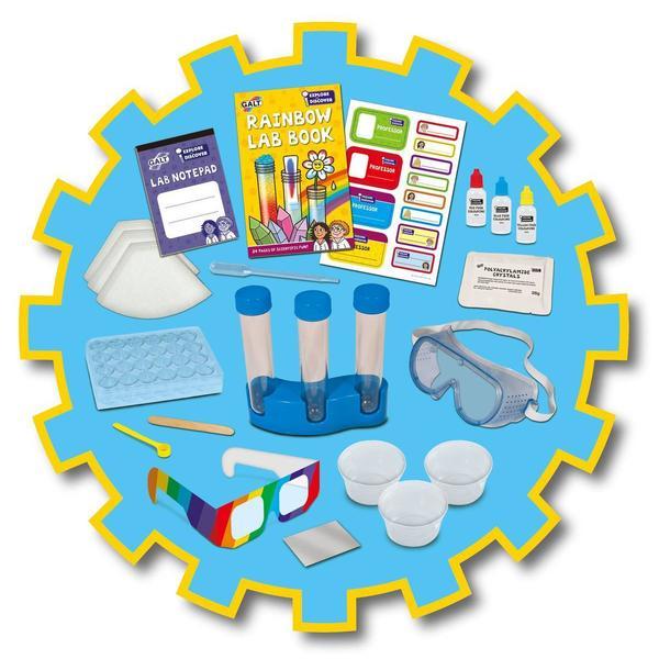 Setul include: 3 eprubete un rastel pentru eprubete ochelari de protectie tavita pentru mixarea culorilor pipeta cristale din poliacrilamida 3 coloranti alimentari ochelari cu curcubeu 3 pahare din plastic filtru de hartie oglinda din plastic betisor pentru mixarea culorilor lingurita de plastic abtibilduri carnetel un ghid de experimente cu 24 de pagini