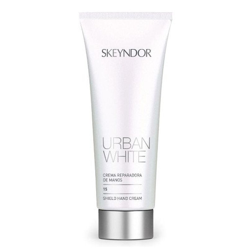 Crema Protectoare pentru Maini - Skeyndor Urban White Shield Hand Cream 75 ml: crema cu o compozitie inovatoare destinata prevenirii imbatranirii premature si a pigmentarii inestetice a mainilor. Datorita ingredientelor specifice, are un rol extrem de benefic in protectia intensa a tenului impotriva efectelor estetice nedorite datorate poluarii urbane (fumuri, hidrocarburi, tutun, soare), revigoreaza tenul si restaureaza echilibrul si bunastarea naturala a pielii.
