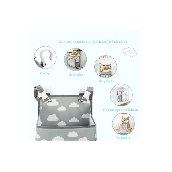 Capacitate mare: ai mult spatiu pentru depozitat. Poti aranja in compartimentul destinat peste 50 de scutece de orice marime, iar in lateral este prevazut cu plase in care poti depozita jucariile bebelusului si toate cele necesare lui. Acest organizator de scutece pentru bebelusi te va ajuta sa tii aproape de patut toate elementele esentiale unui somn linistit si odihnitor.