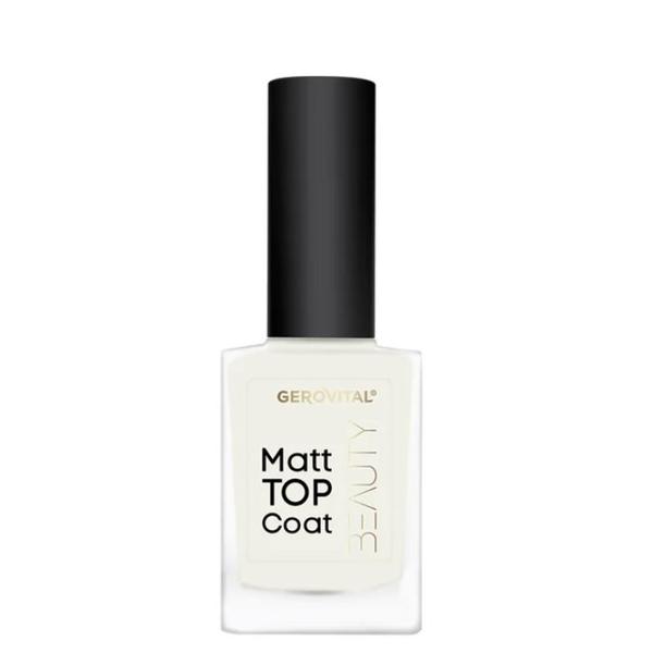 Lac de Unghii - Gerovital Beauty Matt Top Coat, 11 ml: lac transparent de finisare, creat pentru a oferi unghiilor un aspect mat, catifelat si modern. Aplicat peste oja colorata, transforma instant finishul lucios intr-unul opac, uniform, conferind manichiurii un aer elegant si minimalist. Formula sa netezeste suprafata unghiei si ajuta la protejarea culorii, mentinand manichiura intacta mai mult timp si reducand riscul de ciobire. Textura fluida permite o aplicare usoara si precisa, rezultatul fiind un finish profesional, sofisticat si discret. Poate fi folosit atat peste oja clasica, cat si direct pe unghia naturala, pentru un look ingrijit si natural.