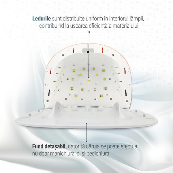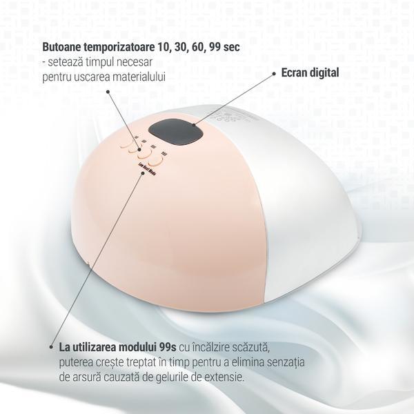 Lampa poate fi comutată, prin simpla apăsare a unui buton, de la 48W la 24W, dacă clientul usucă gelul, și înapoi la 48W, dacă începe să lucreze cu un sistem de gel. Lampa nu este dăunătoare pentru piele sau ochi și nu conține ingrediente nocive. Nu înțeapă în timpul polimerizării. Lampa de unghii are, de asemenea, un design interesant, sub forma unei emisfere, ceea ce face ca aceasta să se potrivească ușor pe întreaga mână. Potrivit pentru uz casnic și salon.