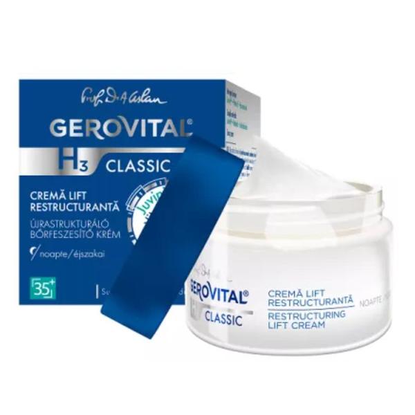 Crema Lift Restructuranta de Noapte - Gerovital H3 Classic Restructuring Lift Cream, 50ml: produs de ingrijire pentru tenul matur si uscat, cu o formula revolutionara ce actioneaza in mod eficient pentru a reduce vizibil semnele de imbatranire. Contine un complex anti-age, format din 3 ingrediente esentiale cu multiple beneficii: acidul hialuronic restaureaza bariera naturala de protectie a pielii, oferindu-i acesteia hranirea si hidratarea necesara, vitamina E protejeaza fibrele de elastina si colagen prin actiunea sa antioxidanta, iar ingredientul inovator Juvinity stimuleaza regenerarea celulelor epidermei, intarziind imbatranirea metabolica a acestora. Amestecul de uleiuri naturale de soia si avocado, unt de shea si Squalane contribuie la furnizarea nivelului adecvat de nutritie a pielii, iar complexul botanic Sepilift completeaza actiunea antirid, lasand tenul elastic, ferm si hidratat, cu un aspect neted si luminos.