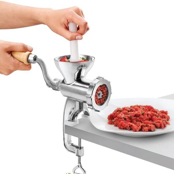 Masina de tocat clasica Jack 8 este robusta si usor de utilizat, ideala pentru tocat carnea, nucile si legumele. Tocatorul este dotat cu un accesoriu pentru coca care poate fi utilizat la modelarea biscuitilor sau a pastelor si cu un accesoriu pentru carnati, in vederea umplerii carnatilor de casa.