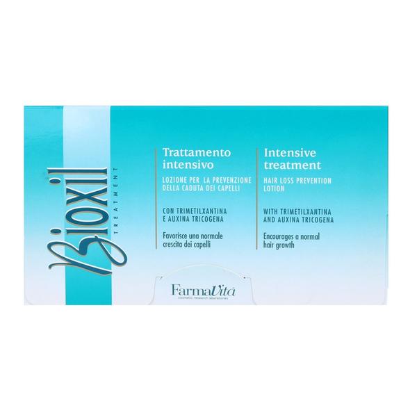 Fiole Tratament Impotriva Caderii Parului - Farmavita Bioxil, 12 x 8 ml: tratament intensiv ce previne caderea parului, fara adaos de parfumuri. Proprietatile lotiunii Bioxil se datoreaza interactiunii componentelor active: auxin trichogena, care imbunatateste circulatia la nivelul scalpului si trimetilxantina (cofeina), care stimuleaza acest proces vital iar vitamina E din compozitie are actiune antioxidanta si protejeaza de radicalii liberi. O combinatie de uleiuri hidratante care se servesc ca tratament functional intensiv pentru prevenirea caderii parului cu actiune adjuvanta de uz estetic.