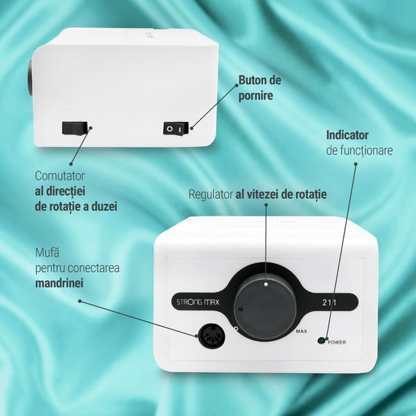 Freza profesionala Strong Max 211 este o freza de calitate, indeplinita la cele mai inalte standarte si apreciata pe piata. Aparatul atribuie multiple intrebuintari pentru realizarea manichiurei si pedichiurei perfecte. Recomandata pentru pilirea gelului si acryl, tratarea cuticulelor, corectia unghiilor, nivelarea placii unghiilor si perfect se ispraveste cu tratarea unghiilor in procesul de pedichiura, indeparteaza pielea aspra, indeparteaza calusurile uscate.