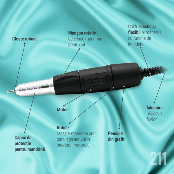 Micromotorul este conceput cu 4 rulmenti, care reduc vibratiile si asigura stabilitatea bitului in timpul prelucrarii placii de unghii. Aceasta pila electrica este ideala pentru uz profesional, oferind performanta si fiabilitate superioara. Freza poseda si diverse bituri, pentru a obtine un rezultat de exceptie.