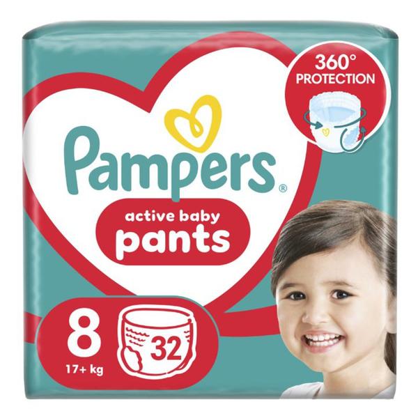 Scutece-Chilotel - Pampers Pants Active Baby, marimea 8 (17+ kg), 32 buc: scutece-chilotel ideale pentru atunci cand bebelusul incepe sa devina mult mai activ. Sunt foarte usor de pus, se trag usor in sus si se scot prin ruperea lateralelor. Dispun de o fixare de jur imprejur, fara spatii neprotejate si fara scurgeri, pentru un semn linistit si o joaca neintrerupta. Sunt ideale chiar si in timpul noptii, datorita sistemului 360° Fit compus din: banda flexibila in jurul taliei, ce se adapteaza burticii bebelusului, nucleul super absorbant ce atrage instant umezeala si marginilor duble pentru picioruse ce ajuta la prevenirea scurgerilor. De asemenea, sunt foarte delicate cu pielea bebelusului.