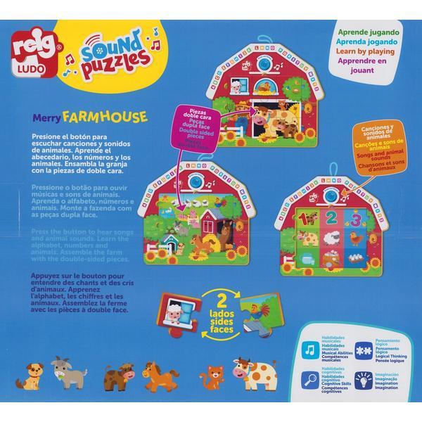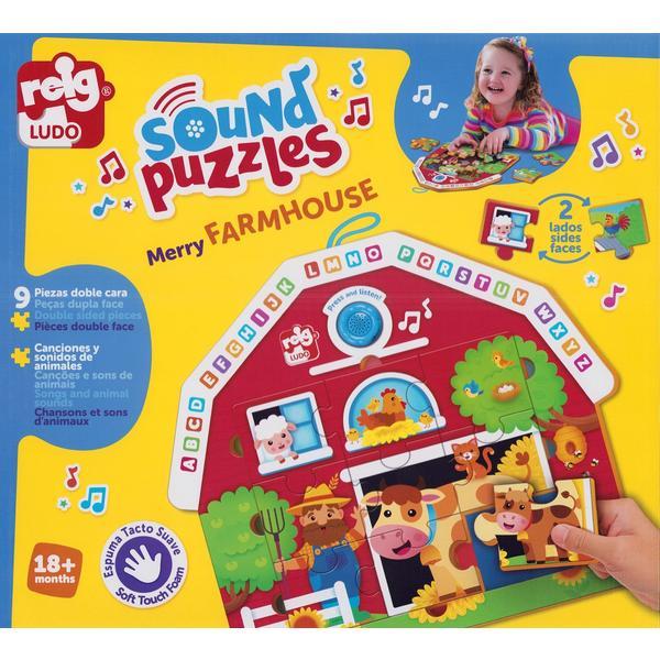 Puzzle cu sunete. Animale de la ferma: Puzzle fata-verso alcatuit din 9 piese fabricate din spuma EVA. Cei mici pot completa puzzle ul in timp ce asculta melodiile si sunetele unor animale de la ferma. Jucaria poate fi un instrument util pentru a-i familiariza pe cei mici si cu literele alfabetului.