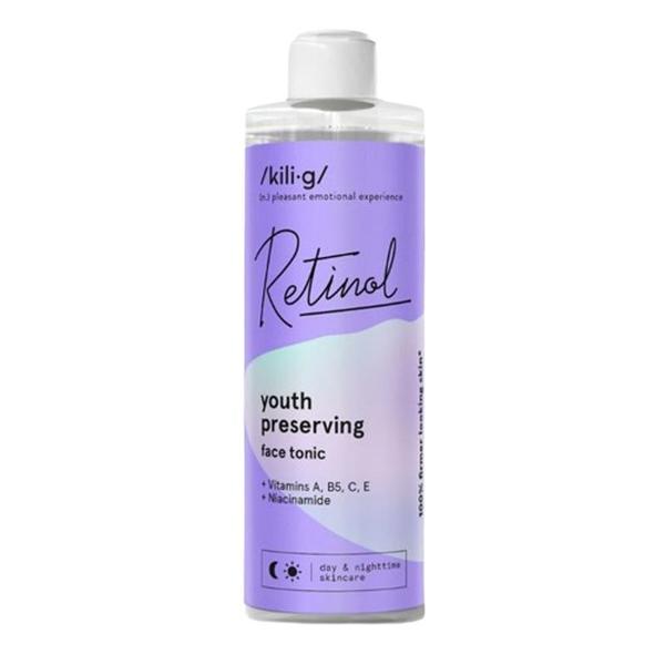 SHORT LIFE - Lotiune Tonica cu Retinol, Acid Hialuronic si Niacinamide - Kilig Youth Preserving Face Tonic Retinol, 250 ml: lotiune tonica cu retinol (vitamina A) conceput pentru a te ajuta sa te bucuri de o piele ferma, stralucitoare si hidratata atunci cand tenul tau are nevoie de un boost de vitalitate. Produsul este imbogatit cu acid hialuronic cu greutate moleculara mare si pantenol (vitamina B5), care sunt importante in hidratarea pielii. Produsul contine si extract de alge marine care asigura fermitate pielii. Dupa utilizarea lotiunii tonice, pielea arata neteda, reinnoita. Produs testat dermatologic.