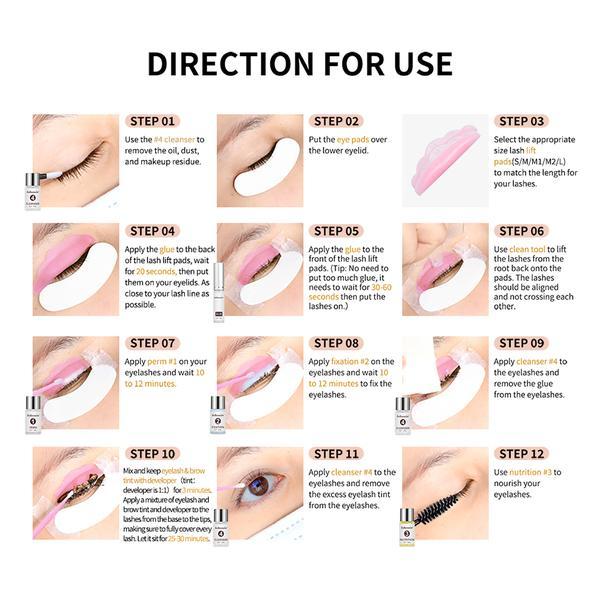 Continutul kit-ului: 1 x 5 ml cleanser, 1 x 5 ml lotiune permanenta, 1 x 5 ml lotiune fixare, 1 x 5 ml lotiune nutritiva, 1x 7 ml adeziv, 1x 20 ml oxidant, 1x 20 ml vopsea, 4 x aplicator Y, 2 x manusi, 2 x perie gene neagra, 5 x aplicatoare, 5 x perie gene roz, 5 x microbrush, 3 x set bigudiuri, 2 x eyepatch.