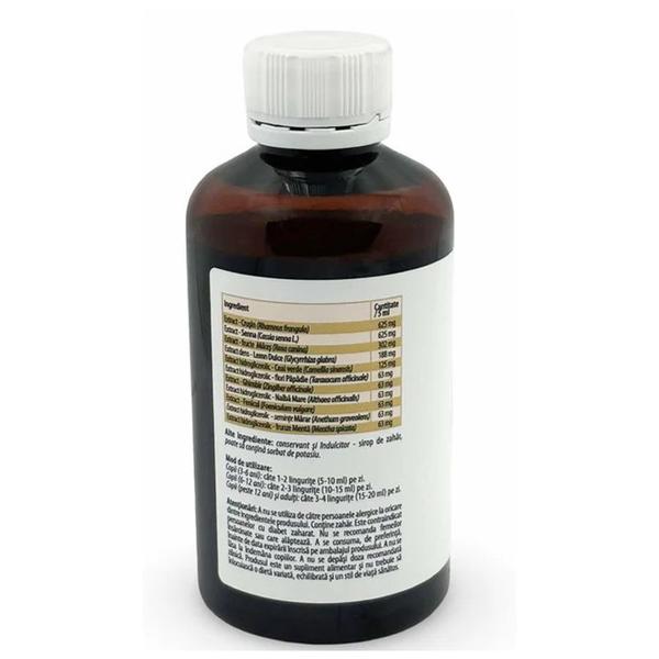 Rhamnus Frangula Extract - Extract De Crusin, Senna Extract - Extract De Senna, Rosa Canina Fruit Extract - Extract Din Fructe De Maces, Glycyrrhiza Glabra Dense Extract - Extract Dens De Lemn Dulce, Camellia Sinensis Leaf Hydroglycolic Extract - Extract Hidroglicerolic Din Frunze De Ceai Verde, Taraxacum Officinale Flower Hydroglycolic Extract - Extract Hidroglicerolic Din Flori De Papadie, Zingiber Officinale Extract - Extract De Ghimbir, Althaea Officinalis Hydroglycolic Extract - Extract Hidroglicerolic De Nalba Mare, Foeniculum Vulgare Extract - Extract De Fenicul, Anethum Graveolens Seed Hydroglycolic Extract - Extract Hidroglicerolic Din Seminte De Marar, Mentha Spicata Leaf Hydroglycolic Extract - Extract Hidroglicerolic Din Frunze De Menta, Magnesium Citrate - Citrat De Magneziu, Conservant Natural: Sirop De Zahar.