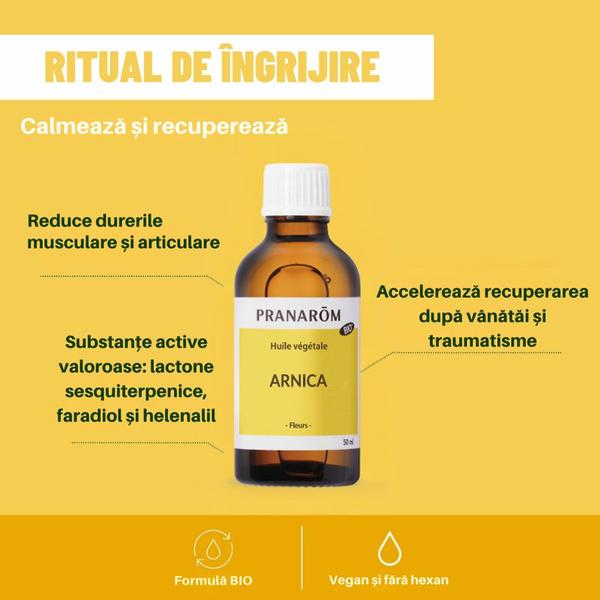 Ulei de Arnica - Pranarom Huile Vegetale Arnica, 50 ml: uleiul de arnica este un macerat vegetal obtinut din florile de arnica cu CO2 si mix de uleiuri vegetale, pentru a stabiliza substante active valoroase: lactone sesquiterpenice, faradiol si helenalil. Ideal pentru un masaj de pregatire pentru efort fizic sau dupa efort fizic sau pentru ameliorarea disconfortului muscular si articular. Este potrivit atat pentru sportivi, cat si pentru utilizare regulata ca parte a rutinei de recuperare.