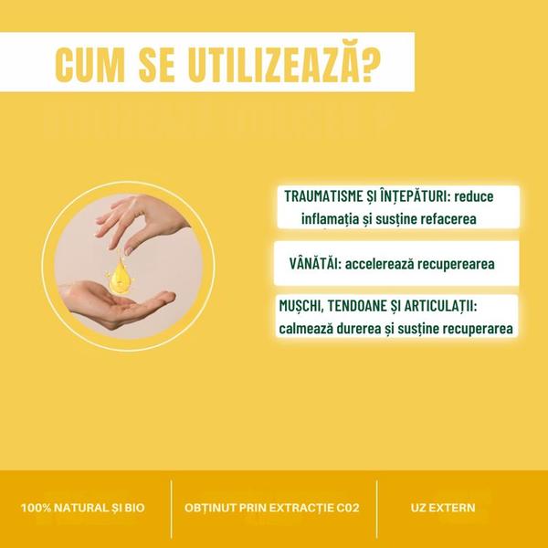 Mod de utilizare: inainte de aplicarea uleiului, curatai usor zona afectata cu apa si sapun. Aplicati o cantitate mica pe zona afectata (muschi, articulatii etc.). Masati peana cand uleiul este complet absorbit. Puteti repeta de 3-4 ori pe zi, in functie de necesitate.
