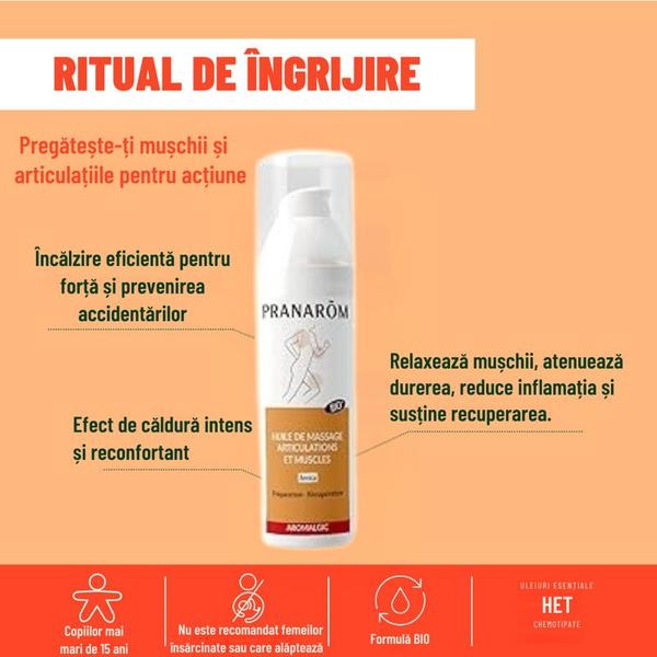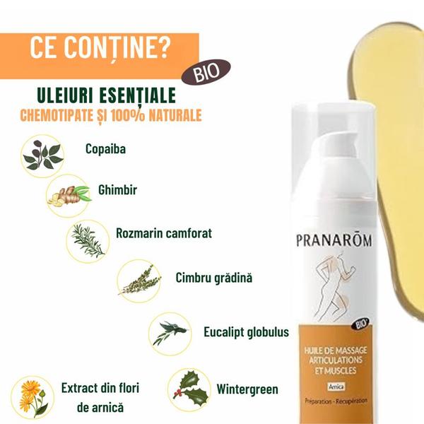 Ulei de Masaj Articulatii si Muschi Bio - Pranarom Aromalgic Huile Massage Bio, 100 ml: uleiul de masaj conceput special pentru a calma tensiunea, durerile musculare si disconfortul articular. Formula sa bogata contine uleiuri esentiale 100% organice, precum lavanda, eucalipt, rozmatin si menta, combiante cu uleiuri vegetale nutritive, pentru un efect revitalizant si relaxant. Uleiul are o textura usoara, se absoarbe rapid fara sa lase pielea lipicioasa, iar parfumul natural de uleiuri esentiale ofera o senzatie suplimentara de relxare si confort.