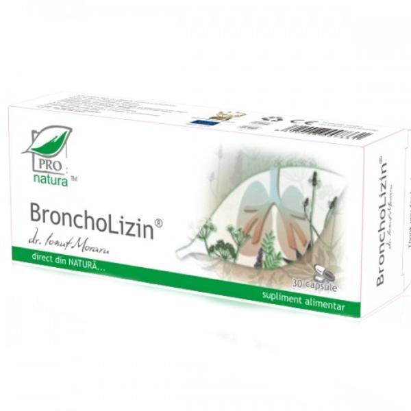 SHORT LIFE - Broncholizin Pro Natura Medica, 30 capsule: este un supliment alimentar ce diminueaza problemele aparatului respirator si creste imunitatea. Calmeaza iritatiile gatului si are un puternic efect antiseptic. Este un bun cicatrizant al mucoaselor respiratorii, usureaza respiratia si favorizeaza expectoratia.