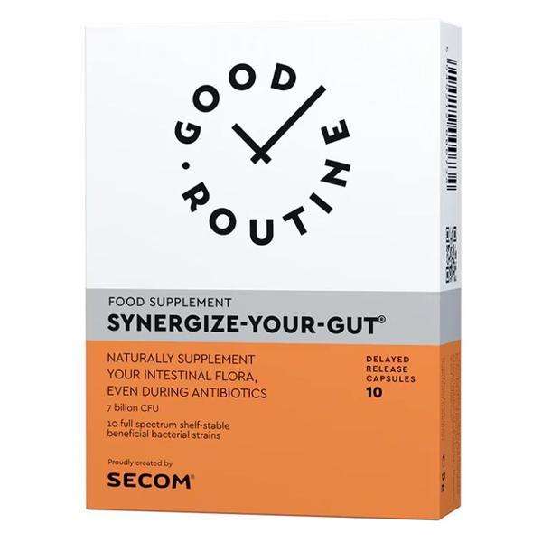 SHORT LIFE - Synergize-Your-Gut Good Routinem Secom, 10 capsule: contine un numar crescut de 10 tulpini bacteriene benefice (7 Lactobacillus si 3 Bifidobacterium), alaturi de o fibra solubila (inulina) pentru repopularea rapida a florei intestinale. Synergize-Your-Gut se foloseste pentru confortul digestiv al intregii familii, o capsula administrata zilnic sustine o flora echilibrata; poate ajuta la sanatatea tranzitului intestinal, eliminarea senzatiei de balonare si gaze; poate ajuta la sustinerea imunitatii; ofera suport in manifestarile alergice. Capsulele cu eliberare intarziata, pot impiedica degradarea tulpinilor bacteriene la nivelul stomacului si favorizeaza eliberarea tulpinilor viabile la nivel intestinal.