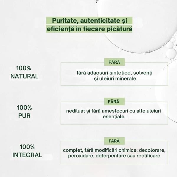 - cosmetic: amestecati 50 picaturi de ulei esential cu 50 ml de ulei de baza. Aplicati acest amestec, prin masaj local, pe ten sau scalp (evitati mucoasele si zona ochilor). Se recomanda utilizarea zilnica sau conform necesitatilor pielii.