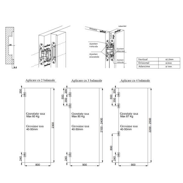De asemenea, aceasta balama ofera posibilitatea ajustarii pe verticala, orizontala si in adancime in orice directie a usii. Acest nivel de ajustare aditional iti ofera libertatea de a asigura o potrivire perfecta. Pentru mai multe detalii tehnice, consultati schita atasata produsului.