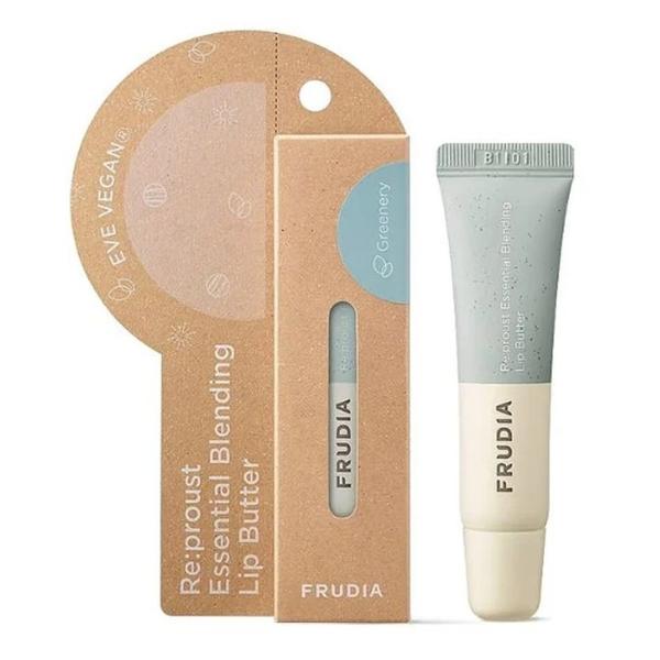 Balsam de Buze - Frudia Re:Proust Essential Blending Lip Butter Greenery, 10 g: balsamul de buze vegan, formulat cu uleiuri vegetale hranitoare, care ofera hidratare intensa si calmare buzelor uscate sau crapate. Textura sa bogata, dar lejera, contine unturi si uleiuri naturale precum uleiul de moringa si untul de shea, ce hranesc pielea delicata a buzelor, lasandu-le moi si netede, si protejate de factorii externi. Potrivit pentru toate tipurile de piele, ideal pentru ingrijirea zilnica si pentru buze catifelate, cu un aspect natural si sanatos.