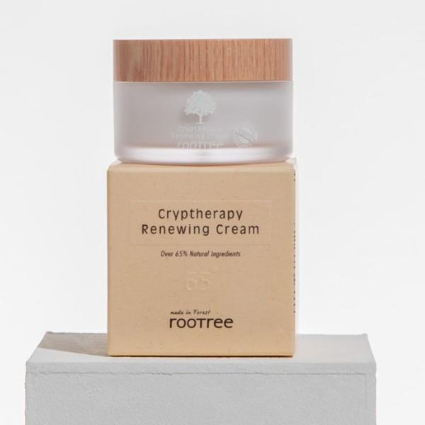 Crema Regeneranta de Fata - Rootree Cryptherapy Renewing Cream, 50 g: crema regeneranta de fata hidrateaza intens si imbunatateste elasticitatea pielii, fara a fasa senzatie lipicioasa sau grasa. Apa pura din Jeju patrunde in profunzimea pielii, in timp ce extractele de frunze de Cryptomeria, menta si nap brassica ajuta la refacerea barierei cutanate si la calmarea tenului. Formula sa bogata in unt de shea, ulei de macadamia, squalane si extract de germeni de grau hraneste pielea in profunzime si previne uscarea. Crema ofera fermitate, catilfelare si un asepct sanatos pielii, fiind ideala pentu tenul uscat, sensibil sau lipsit de vitalitate.