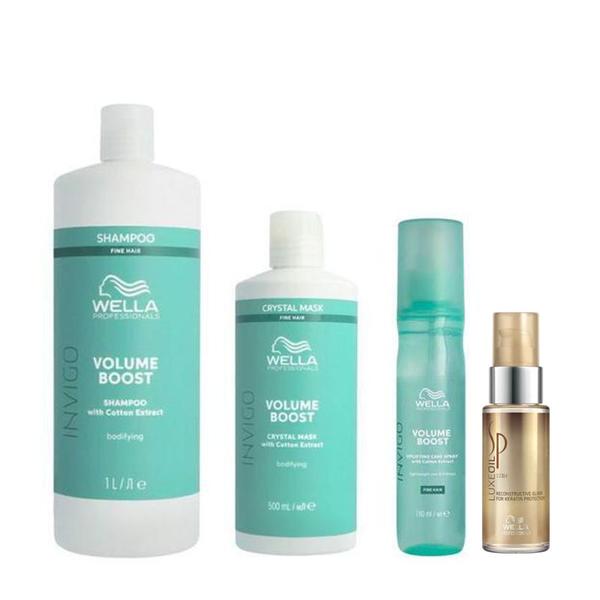 Pachet pentru Volum - Wella Professionals Invigo Volume Boost: Sampon 1000 ml, Masca 500 ml, Spray 100 ml + Ulei Reconstructiv 30 ml: pachet pentru o ingrijire completa a parului fin, cu fir subtire si lipsit de vitalitate, ce confera acestuia un volum natural, stralucire si hidratare. Contine urmatoarele produse: