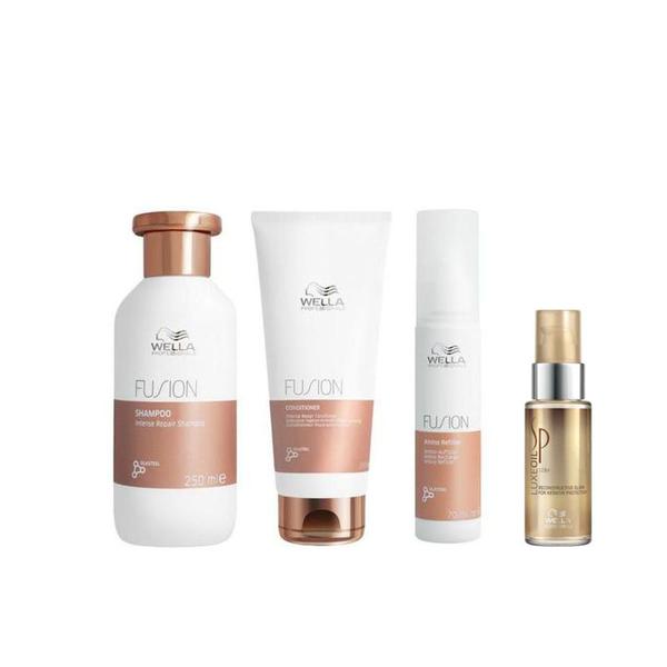 Pachet cu Efect Reparator - Wella Professionals Fusion Intense: Sampon Reparator 250 ml, Balsam Reparator 200 ml, Tratament cu Aminoacizi 70 ml + Ulei Reconstructiv 30 ml: