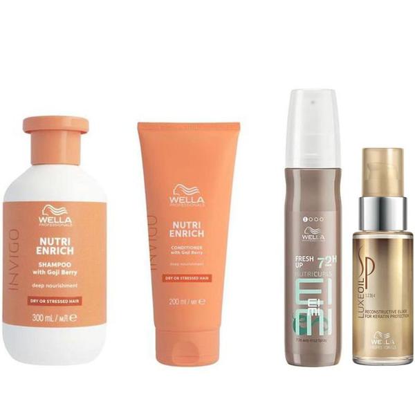 Pachet Intens Nutritiv pentru Par Cret, Uscat si Deteriorat - Wella Professionals Nutri-Enrich & Eimi Nutricurls: Sampon 300 ml, Balsam 200 ml, Spray 150 ml + Ulei Reconstructiv 30 ml: