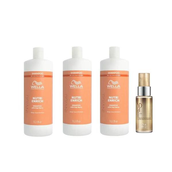 Pachet 3 x Sampon Intens Nutritiv pentru Par Uscat si Deteriorat - Wella Professionals Invigo Nutri-Enrich, 1000 ml + Ulei Reconstructiv 30 ml: