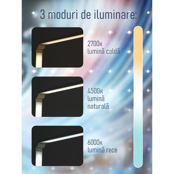 Trei moduri de lumină: caldă, naturală și rece (2700–6000K).