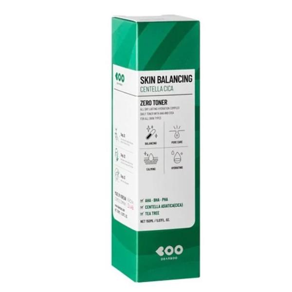 Toner pentru Curatare si Echilibrare a Pielii cu Centella Asiatica - Dearboo Skin Balancing Centella Cica Zero Toner, 150 ml: tonerul curata delicat, hidrateaza si echilibreaza pielea, oferind o senzatie de prospetime si confort. Formula sa contine acizi AHA, BHA si PHA, care exfoliaza usor celulele moarte si elibereaza porii, prevenind aparitia imperfectiunilor. Extractul de Centella Asiatica (CICA) si arbore de ceai calmeaza pielea iritata si reduc roseata, ajutand la refacerea barierei cutanate. Produsul are o textura lejera, fara alcool si parfum, potrivita pentru toate tipurile de ten, inclusiv cel sensibil sau mixt.