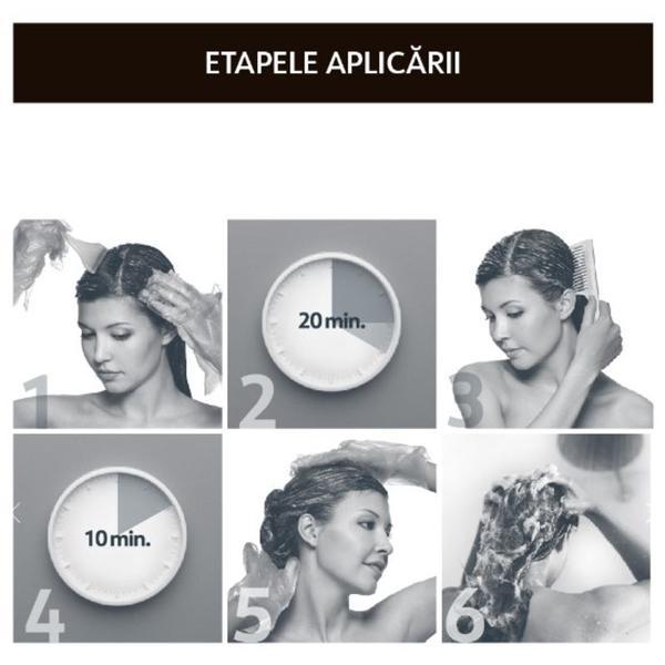 Mod de utilizare: nu spalati parul cu 48 ore inainte de vopsirea parului. Intre decolorarea sau ondulare/ indreptarea permanenta si vopsirea parului trebuie sa treaca minimum 15 zile. Se recomanda aplicarea vopselei pe tot parul daca este prima utilizare a unei vopsele permanente, sau daca urmele unei colorari anterioare nu mai sunt vizibile. Se utilizeaza intreg continutul tubului de vopsea si al flaconului de emulsie oxidanta (raportul de amestecare vopsea: oxidant este 1:1 - 50 ml:50 ml), care se amesteca intr-un vas nemetalic pana la completa omogenizare si apoi se aplica pe parul uscat, conform instructiunilor din prospect. Se distribuie amestecul pe par, suvita cu suvita, de la radacini spre varfuri si apoi se uniformizeaza pe par, folosind un pieptene rar, de plastic. Amestecul se lasa sa actioneze 30 de min pe parul normal; 15-20 de minute pe parul cu fir subtire; 10-15 minute pe par decolorat sau ondulat permantent; 35-40 minute pe firul gros, sticlos, sau cu procent mare de fire albe. Nu se depaseste durata maxima recomandata. Dupa expirarea timpului, se umezeste parul si se maseaza aproximativ 1 minut, apoi se clateste cu multa apa, pana cand aceasta devine limpede.