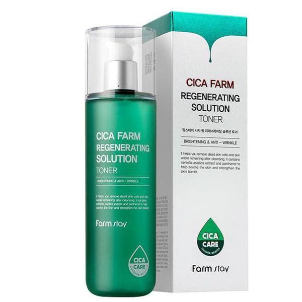 Toner Regenerant cu Extract de Centella Asiatica - FarmStay Cica Farm Regenerating Solution Toner, 200 ml: tonerul facial ofera o ingrijire intensa si calmanta pentru pielea sensibila. Formula sa delicata, imbogatita cu extract de Centella Asiatica si pantenol, indeparteaza eficient celulele moarte si impuritatile, contribuind la calmarea si intarirea barierei cutanate. Ideal pentru utilizare zilnica, echilibreaza nivelul de hidratare, reduce iritatiile si imbunatateste textura generala a pielii. Datorita formulei sale blande, dar eficiente, aceasta lotiune tonica sprijina regenerarea pielii si ofera un aspect vizibil mai uniform, radiant si sanatos. Textura usoara si revigoranta se absoarbe rapid, pregatind pielea pentru urmatoarele etape de ingrijire.