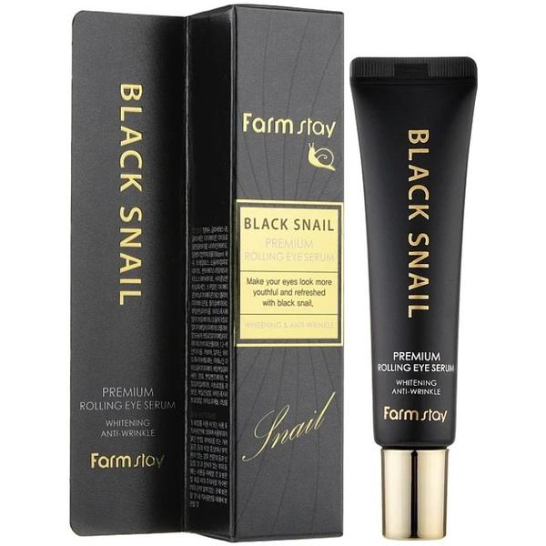 Ser Hidratant pentru Ochi cu Extract de Melc Negru - FarmStay Black Snail Premium Rolling Eye Serum, 25 ml: serul pentru ochi cu extract de melc negru ofera o ingrijire intensiva zonei delicate din jurul ochilor, reducand vizibil semnele de oboseala si primele linii fine. Formula sa bogata in filtratat de secretie de melc negru, peptide si niacinamida stimuleaza regenerarea celulara, hidrateaza si reda fermitatea pielii. Datorita aplicatorului roll-on, serul se distribuie uniform si ofera un efect racoritaor ce ajuta la reducerea umflaturilor si la revigorarea privirii. Piele din jurul ochilor devine mai neteda, mai luminoasa si vizibil mai tanara.
