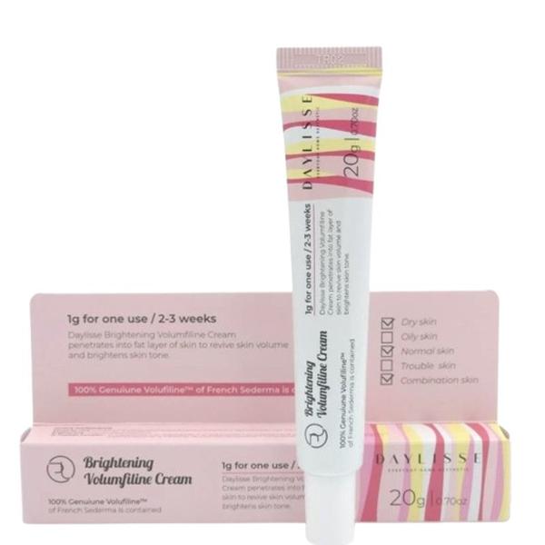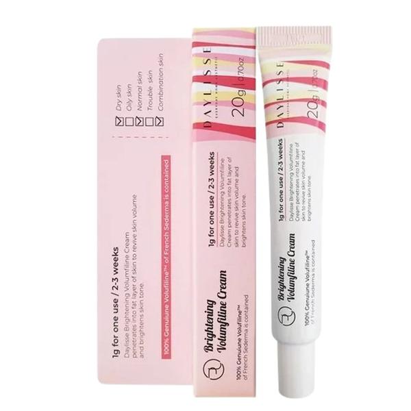 Crema de Fata Iluminanta cu Volufiline - Daylisse Brightening Volumfiline Cream, 20 g: crema iluminatoare cu complex Volufiline™ este conceputa pentru a reda fermitatea si vitalitatea pielii, oferind in acelasi timp o hidratare profunda si o stralucire naturala. Formula sa concentrata, imbogatita cu acid hialuronic, colagen si niacinamida, ajuta la estomparea liniilor fine si la imbunatatirea elasticitatii pielii. Volufiline™, un ingredient activ de origine franceza, contribuie la redensificarea pielii si la conturarea trasaturilor fetei, oferind un aspect mai plin si mai tanar. Datorita extractelor botanice si complexului de peptide, crema sustine regenerarea celulara si protejeaza bariera naturala a pielii. Textura sa matasoasa se absoarbe rapid, fara a lasa urme grase, oferind un finisaj catifelat si luminos. Ideala pentru utilizarea zilnica, aceasta crema transforma pielea terna si obosita intr-un ten vizibil mai ferm, uniform si radiant.