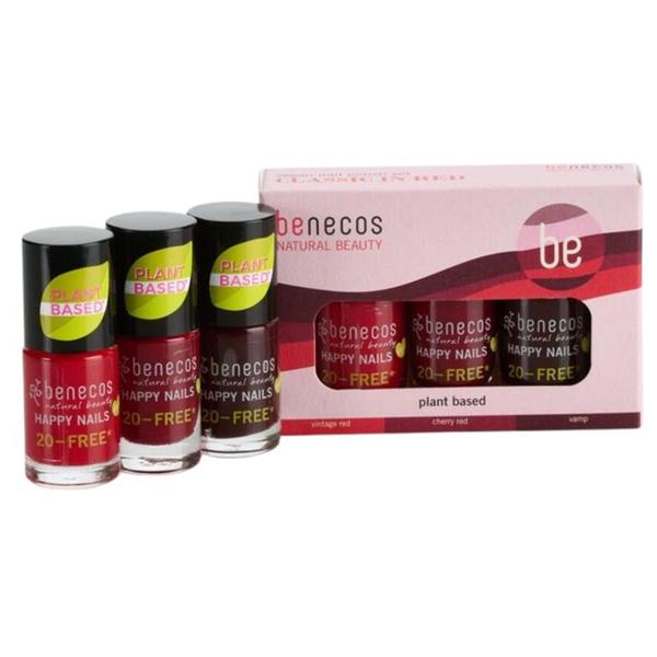 Set 3 Lacuri de Unghii Naturale 20-Free, Vegane – Benecos Classic in Red, 1 pachet: Clasic in rosu!: acest set de oje vegane reuneste trei nuante elegante si atemporale de rosu: rosu vintage, rosu cires si vamp. Formula 20-FREE, pe baza de plante, contine minimum 80% ingrediente de origine naturala, obtinute din materii prime regenerabile. Textura permite schimbul de aer si apa, ajutand unghiile sa ramana flexibile si sanatoase. Ojele sunt imbogatite cu ulei hranitor din seminte de mar (derivat din productia de cidru) si biotina (vitamina H), pentru un plus de ingrijire si fortifiere. Perfect pentru o manichiura vibranta, moderna si prietenoasa cu unghiile - ideale pentru orice moment al zilei sau al sezonului.