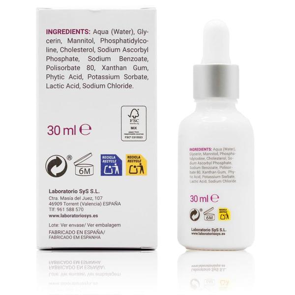 Aqua, Glycerin,mannitol, Phosphatidylcholine,cholesterol, Sodium Ascorbyl, Phosphate, Sodium Benzoate, Polisorbate 80, Xanthan Gum, Phytic Acid, Glyceryl Laurate, Benzyl Alcohol, Potassium, Sorbate, Lactic Acid, Sodium Chloride.
