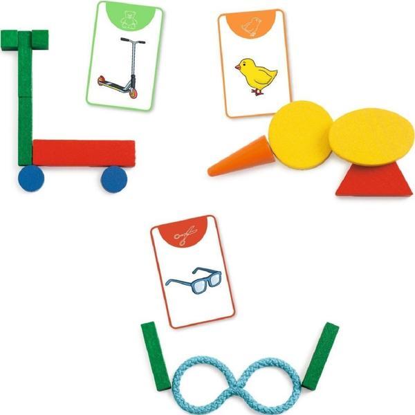 Lasă-ți imaginația să prindă formă cu acest joc creativ de ghicit! Folosește formele din lemn și o bucată de sfoară pentru a recrea animale, obiecte sau plante și provoacă-i pe ceilalți jucători să ghicească ce ai construit. Fiecare rundă este o nouă aventură plină de râsete, idei originale și comunicare în echipă. Ideal pentru seri în familie sau petreceri între prieteni, jocul dezvoltă gândirea vizuală, imaginația și spiritul de colaborare.