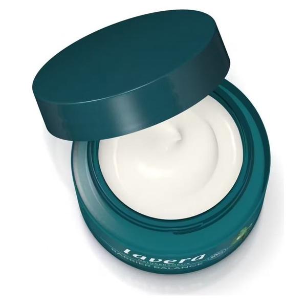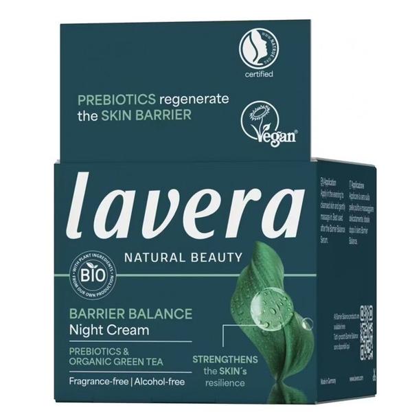 Crema de Noapte Echilibranta Unisex cu Prebiotice, Fara Parfum si Alcool - Lavera Barrier Balance Night Cream, 50 ml: crema de noapte echilibranta actioneaza intens in timpul somnului pentru a sustine refacerea barierei naturale a pielii si a reduce sensibiliatea. Formula avansata cu prebiotice ajuta la mentinerea echilibrului microbiomului cutanat, contribuind la o piele mai puternica, mai calma si vizibil mai uniforma. Extractul organic de ceai verde si complexul nutritiv vegetal hidrateaza si regenereaza pielea, imbunatatind elasticitatea si confortul nocturn. Textura cremoasa si delicata se absoarbe rapid, fara a incarca pielea, conferind un confort intens pe durata intregii nopti. Creata din ingrediente naturale, certificata bio, vegana, fara parfum si fara alcool, crema este ideala pentru toate tipurile de ten, inclusiv pentru pielea sensibila, reactiva sau usor iritabila. Potrivita atat pentru femei, cat si pentru barbati.