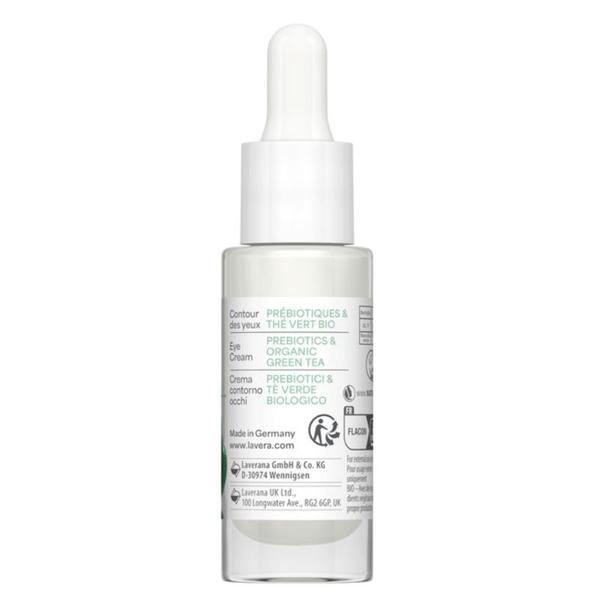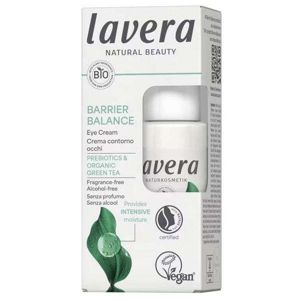 Crema de Ochi Unisex cu Prebiotice, Anti-cearcane si Calmare, Fara Parfum - Lavera Barrier Balance Eye Cream, 15 ml: crema de ochi vegana, special formulata pentru pielea sensibila din zona ochilor, calmeaza, hidrateaza si reduce vizibil cearcanele si semnele de oboseala. Formula cu prebiotice sustine microbiomul pielii, intareste bariera naturala si contribuie la cresterea rezistentei pielii la factorii externi. Extractul organic de ceai verde si ingredientele naturale hidratante lumineaza zona ochilor si imbunatatesc textura pielii, lasand-o neteda, confortabila si revitalizata. Textura usoara se absoarbe rapid, fara sa lase film gras, fiind ideala pentru rutina zilnica. Formula fara parfum si alcool este potrivita pentru pielea sensibila, reactiva sau uscata. Recomandata pentru femei si barbati.