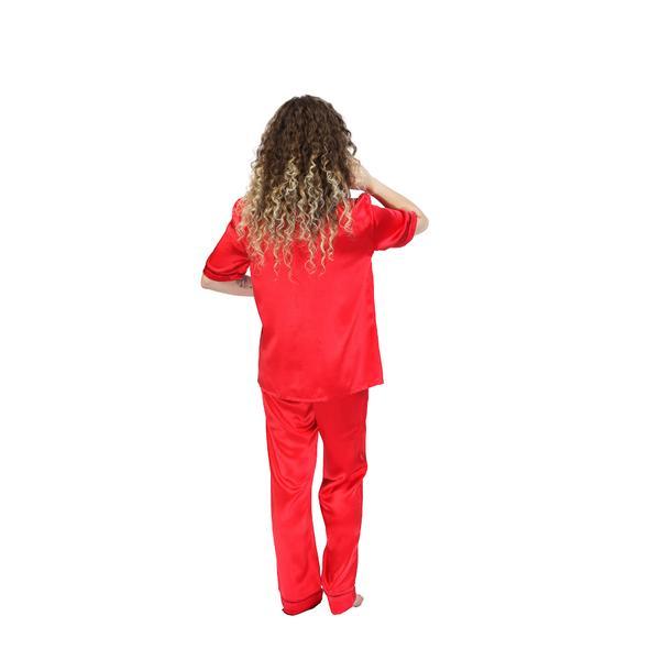 Pijama de damă din mătase naturală 100%, roșie cu vipușcă și nasturi negri. Ținută lejeră și senzuală. Mătasea este însoțită de certificat de calitate și conformitate.