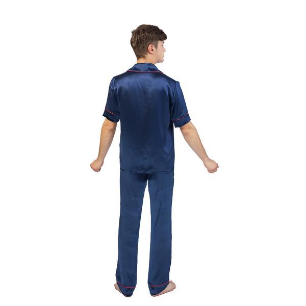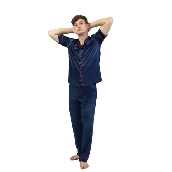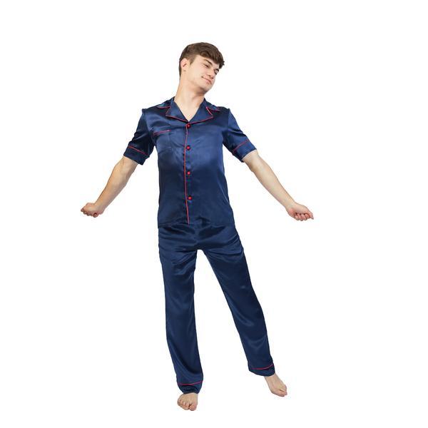 Pijama din mătase naturală 100%, bleumarin cu vipușcă și nasturi roșii. Produsul este însoțit de certificat de calitate și conformitate.