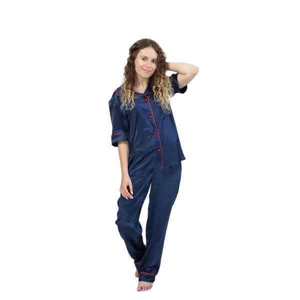 Pijama de damă din mătase naturală 100%, bleumarin cu vipușcă și nasturi roșii. Ținută lejeră și senzuală. Mătasea este însoțită de certificat de calitate și conformitate.