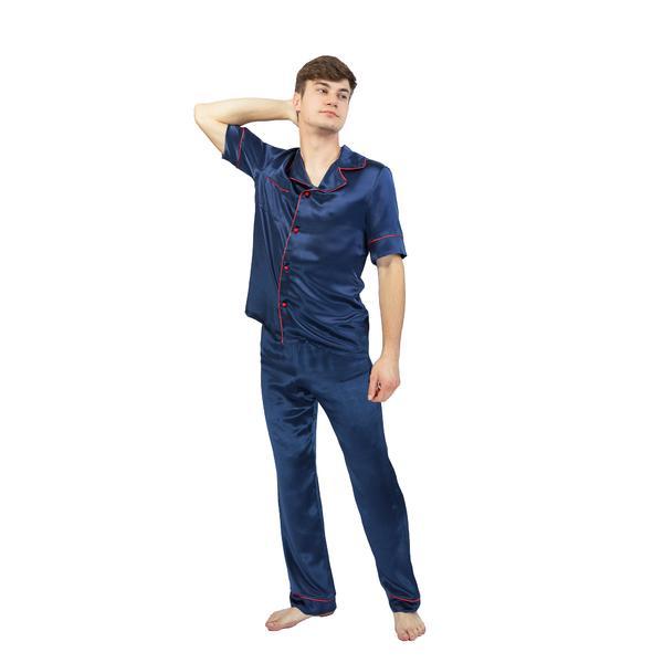 Pijama din mătase naturală 100%, bleumarin cu vipușcă și nasturi roșii. Produsul este însoțit de certificat de calitate și conformitate.