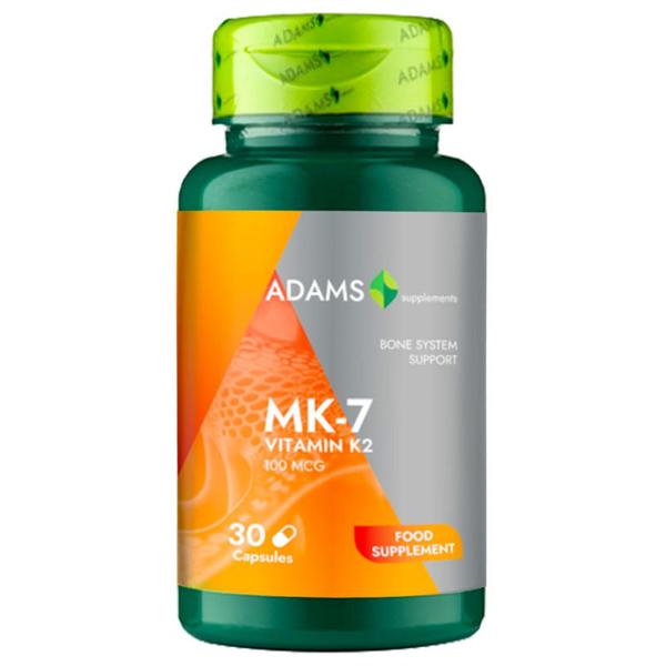 MK-7 (Vitamina K2) - Adams Supplements Bone System Support, 30 capsule: vitamina cu rol esential in mentinerea sanatatii oaselor si a sistemului cardiovascular, cu absorbtie optima si actiune de durata. Ajuta la directionarea calciului catre oase si dinti, pentru a preveni depunerile de calciu pe artere, mentinand elasticitatea vaselor de sange. Contribuie la coagularea normala a sangelui si sprijina formarea corecta a masei osoase. Este ideala pentru persoanela care iau vitamina D sau calciu.