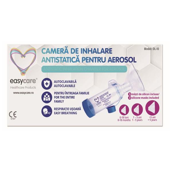 Camera de Inhalare Antistatica pentru Aerosol, 3 Masti Silicon - Easy Care DL-10: dispozitiv medical pentru administrarea tratamentelor cu aerosol prin instalare, pentru o eliberare eficienta a medicamentului. Medicamentul nu adera la peretii camerei, pentru o dozare eficienta si absorbtie superioara a substantei active in caile respiratorii. Contine 3 masti din silicon, de diferite dimensiuni, potrivite pentru intreaga familie: 0-18 luni, 1-5 ani si peste 5 ani - adulti. Camera este autoclavabila, pentru a permite o igienizare sigura si completa, mentinand un nivel ridicat de protectie si curatenie. Are design ergonomic si valva faciliteaza respiratia chiar si in cazul copiiilor mici sau al persoanelor cu capacitate respiratorie redusa. Compatibilitate cu majoritatea inhalatoarelor presurizate, pentru tratamentul afectiunilor respiratorii acute si cronice, precum astmul sau bronsiolita.