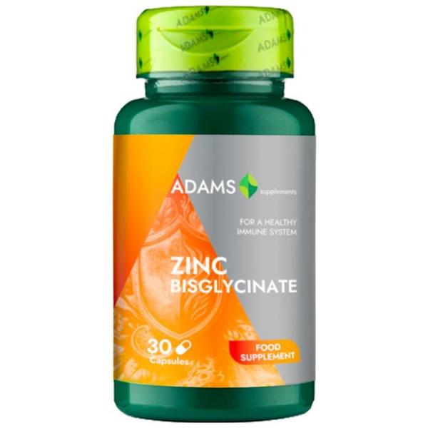 Bisglicinat de Zinc - Adams Supplements Healthy Immune System, 30 capsule: supliment alimentar usor de organism, bine tolerata la nivel gastric, care ajuta la sustinerea imunitatii, sanatatii pielii si echilibrului hormonal, esential in numeroase procese celulare. Protejeaza celulele impotriva stresului oxidativ si participa la sinteza normala a proteinelor si la diviziunea celulara. Este recomandat pentru intarirea imunitatii, probleme dermatologice sau caderea parului, sustinerea nivelului de testosteron la barbatii activi, detoxifierea celulara si sustinerea vederii.