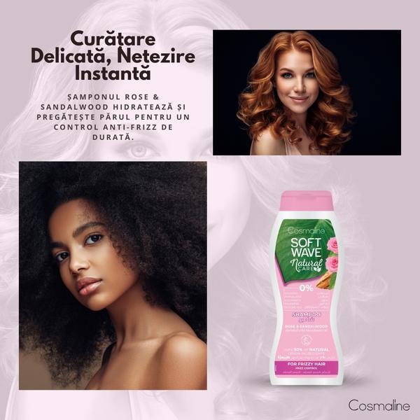 Set 2 × Șampon 400 ml & 2 × Balsam 400 ml - Cosmaline Soft Wave Natural Care – Rose & Sandalwood – Pentru Păr Rebel / Împotriva Electrizării – Peste 90% Ingrediente de Origine Naturală