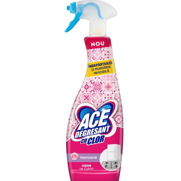 Spray Degresant pentru Bucatarie cu Parfum de Trandafir, cu Clor - ACE Degresant Bucatarie, 650 ml: solutie puternica pentru curatarea bucatariei, special creata pentru a dizolva rapid grasimea si murdaria persistenta. Formula pe baza de clor actioneaza in profunzime, indepartand depunerile dificile si igienizand suprafetele intr- o singura aplicare. Ideal pentru curatarea aragazului, hotei, plitei, cuptorului, blatului de lucru si a suprafetelor din gresie si faianta. Lasa suprafetele perfect curate si igienizate si o aroma placuta de trandafir.